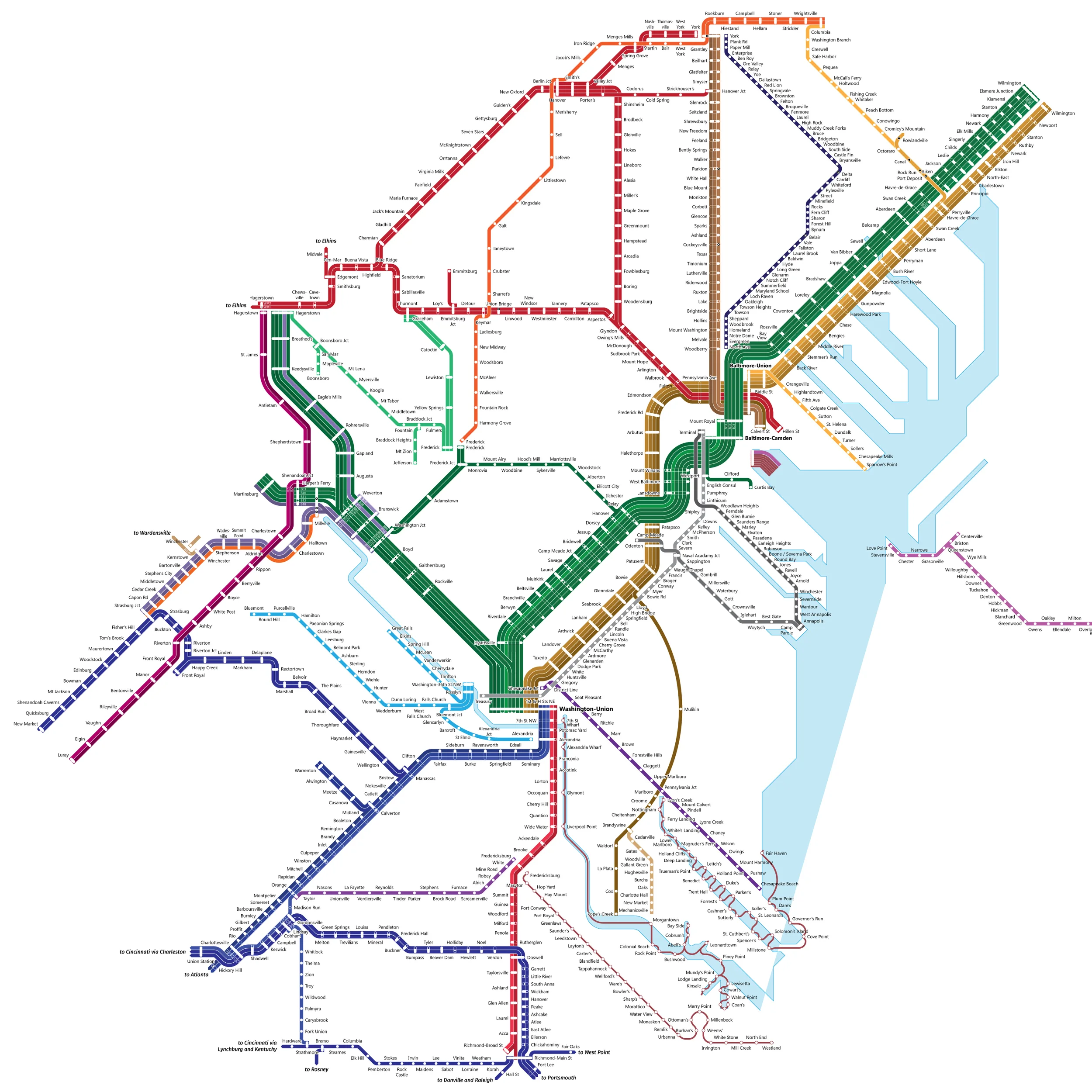 When last we met, I had finished up Baltimore and was on my way to Washington. We've made it way, way out of Washington now, with service patterns to Hagerstown, Richmond, and York all laid out. I've finally started to chart out river ferry service, which means laying out geography, and that means I can start putting together service to the Eastern Shore and Delaware.